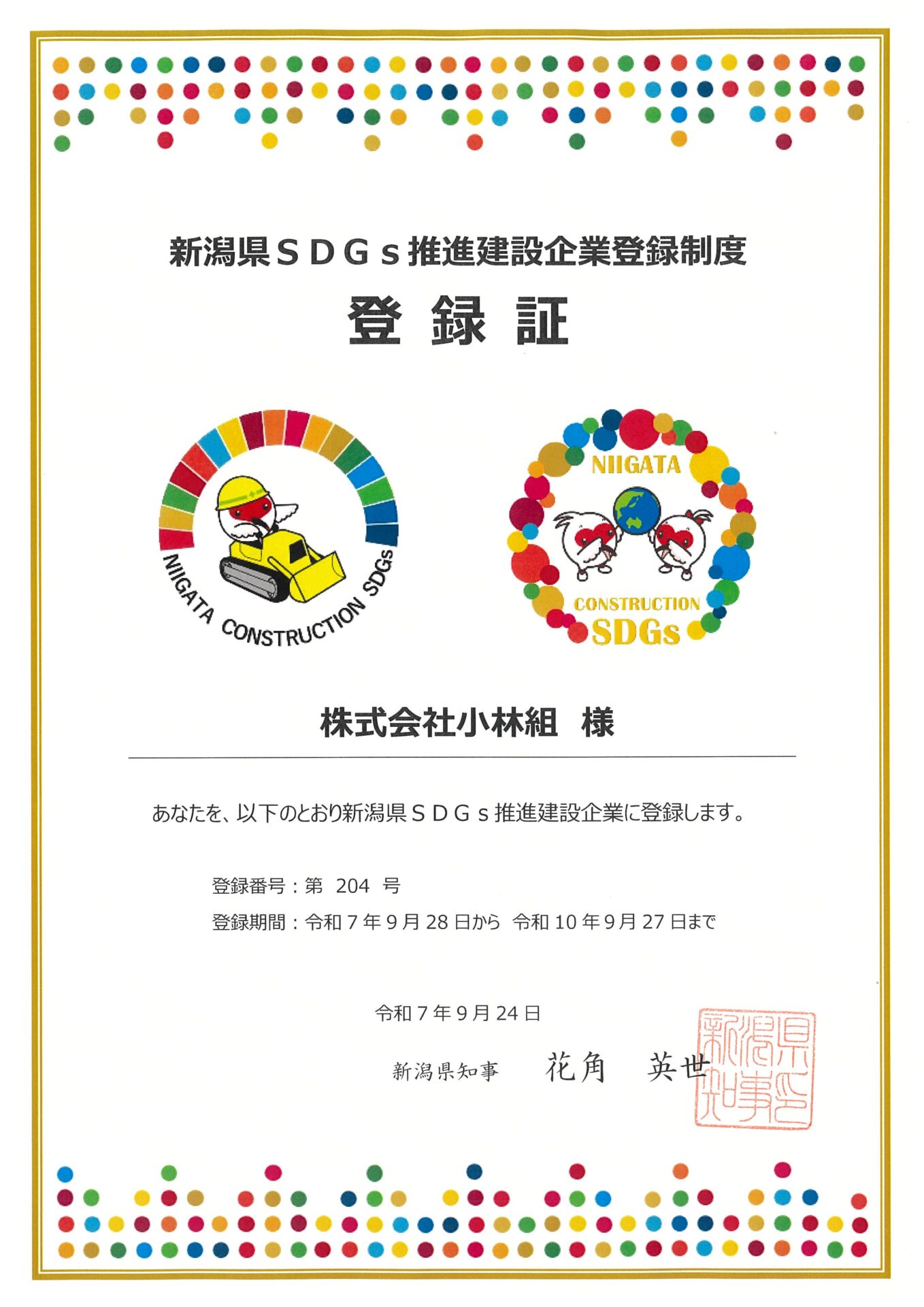 令和4年9月28日「新潟県SDGs推進建設企業登録制度」に参画し、